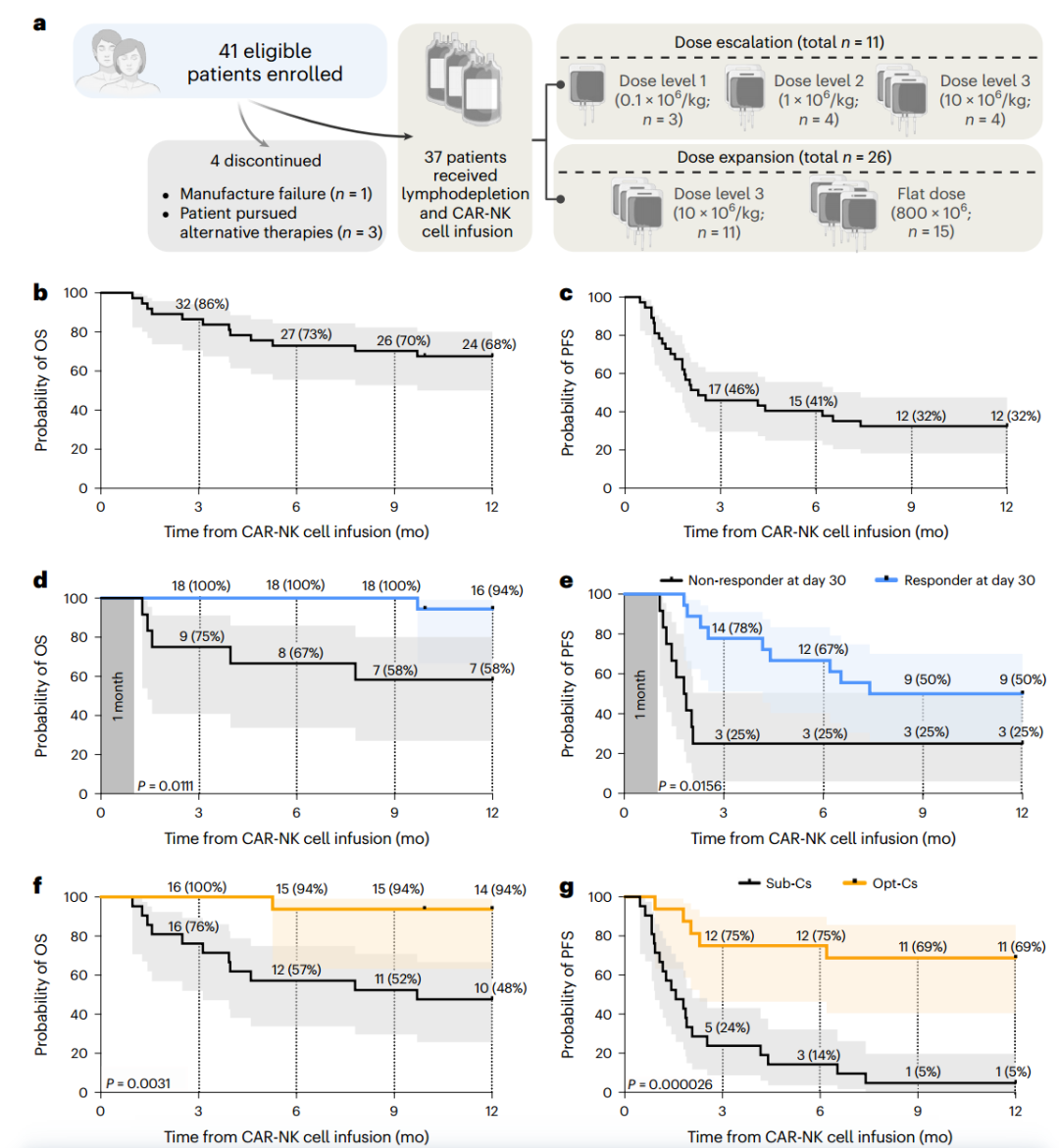 该临床试验的主要目标是安全性和有效性评估,定义为治疗第30天时的总缓解率(OR),次要目标包括第100天时的总缓解率、无进展生存期(PFS)、总生存期(OS)和CAR19/IL-15 NK细胞的持久性。结果显示,患者没有出现严重细胞因子释放综合征、神经毒性或移植物抗宿主病。第30天和第100天的OR率均为48.6%。一年总生存率和无进展生存率分别为68%和32%,取得OR的患者有更高水平的CAR-NK细胞数量和更长的持久性。